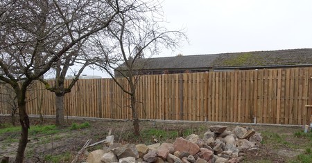 Der Zaun auf der Ostseite des Gartens steht gut. Er hat aber auch ein tiefes Fundament und ist aus 25mm dicken Brettern selbstgebaut, also eher Festungswand als Zaun:
