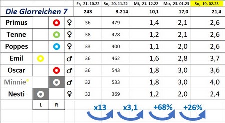 19.2.23 Heute ist es knapp einen Monat her, dass wir die 'Kleinen' gewogen haben. Also war es wieder soweit - und das ist das Ergebnis: