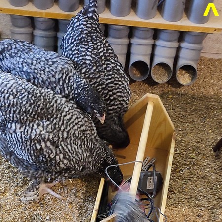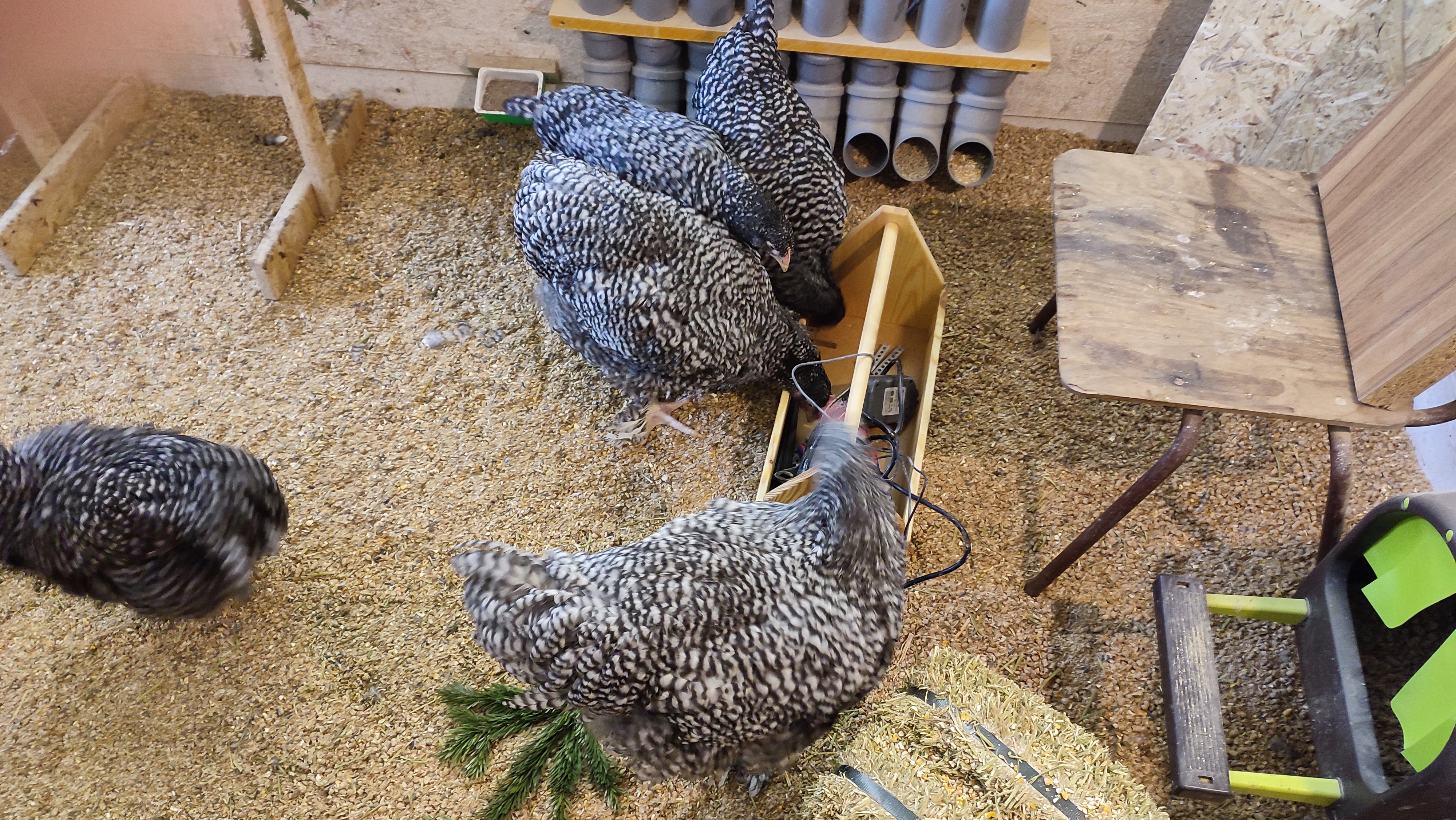 Neulich habe ich bei Youtube gesehen, wie die Klauenpflege bei Schafen gemacht werden kann: In einem Stand, in den die Schafe wegen Leckerchen gerne reingehen, und wo der Pfleger von der Seite in guter Arbeitshöhe an die Schafe rankommt. Mit dieser Idee habe ich einen Stand gebaut, der seit ein paar Tagen im Stall steht und gerne genutzte Sitzgelegenheiten bietet. Da kam heute früh die Waage rein - und die Hühnchen haben gleich "inspiziert". Und schon waren die ersten Wägungen erledigt! Die anderen Damen und Herren wurden mit den absoluten Lieblingsleckerchen gelockt, Soldatenfliegenlarven. Und ruck zuck waren alle gewogen. Super einfach, sehr entspannt.