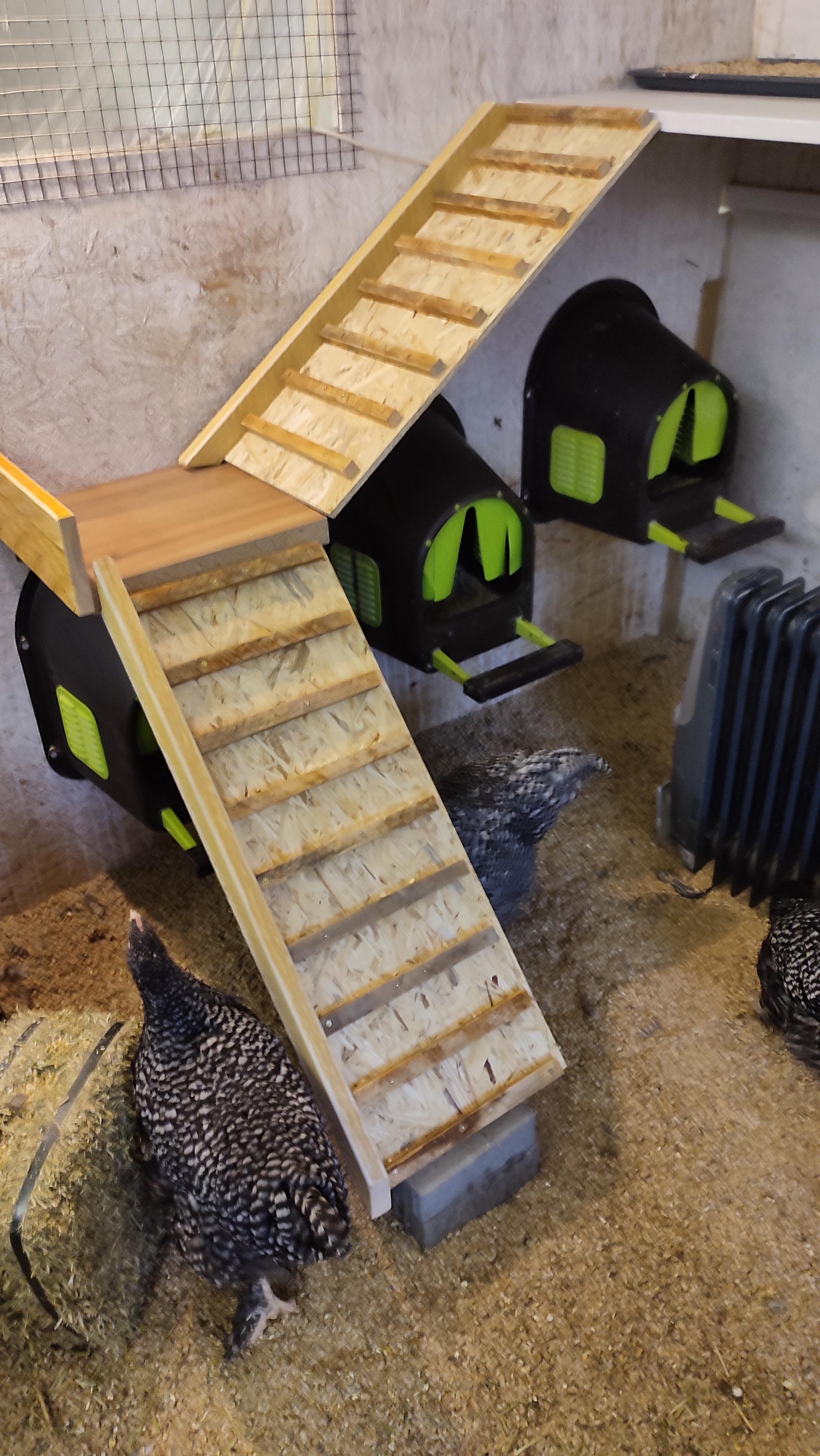 Die Fensterbank ist zwar gemütlich, weil ganz neu eingebaut und gut isoliert, aber wir finden schon, dass alle Damen und Herren zusammen auf der Stange schlafen sollten. Also haben wir heute eine neue, flachere Leiter eingebaut.