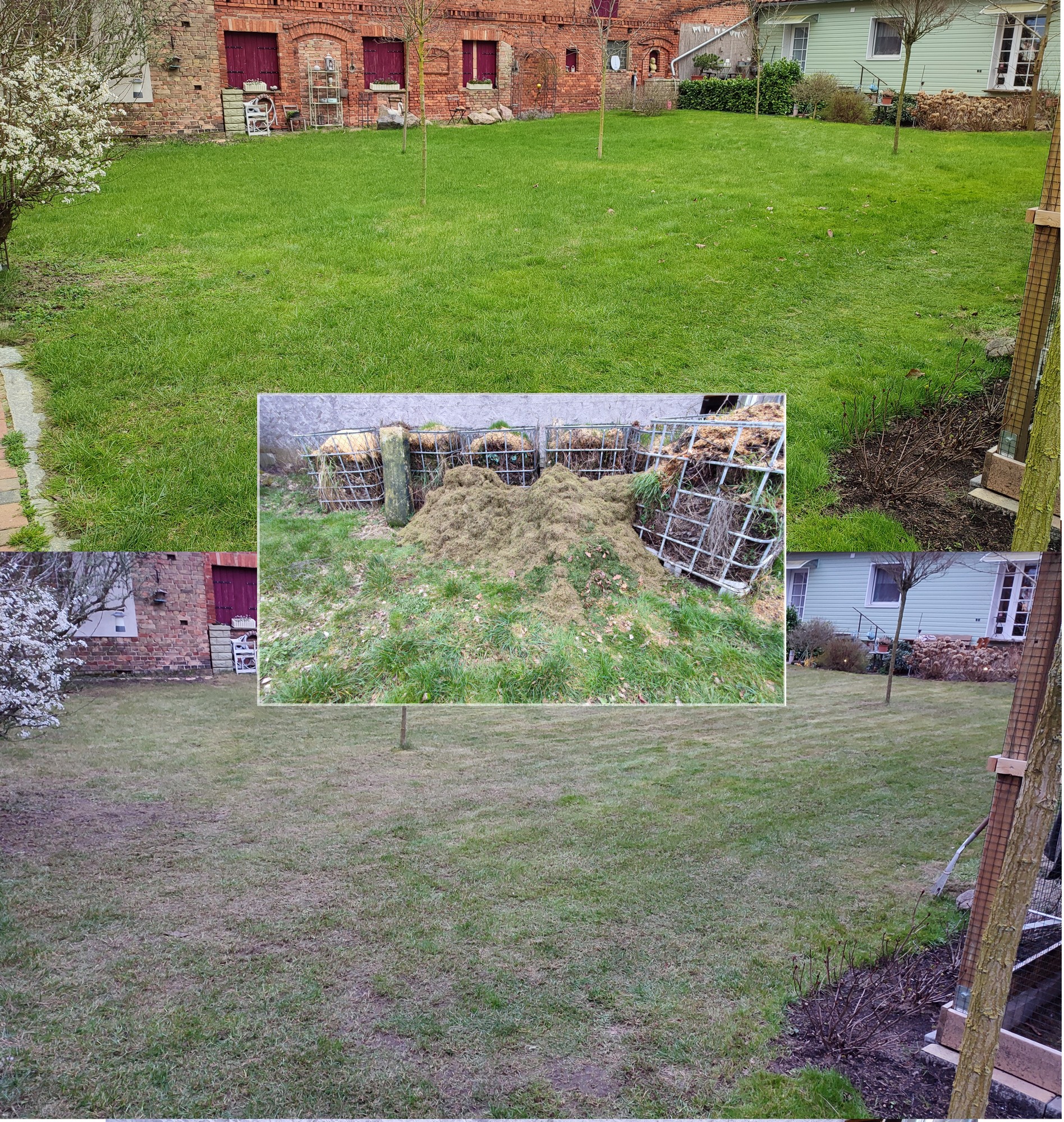 29.03.23 Es mag ja sein, dass das Wetter Anderes vorhat, aber wir fangen jetzt an, draußen zu arbeiten. Basta. Heute haben wir die Wiese im Hof vertikutiert (das Moos hatte sich extrem verbreitet).