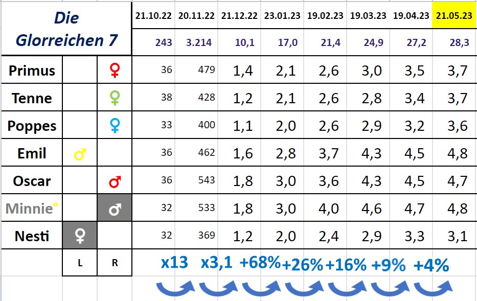 21.5.23 Eigentlich wäre diese Wiegung schon am 19. fällig gewesen, aus 'organisatorischen Gründen' haben wir sie aber auf heute verschoben. Und das ist dabei rausgekommen: