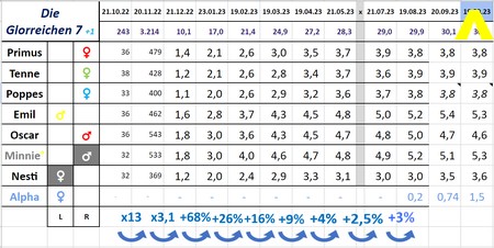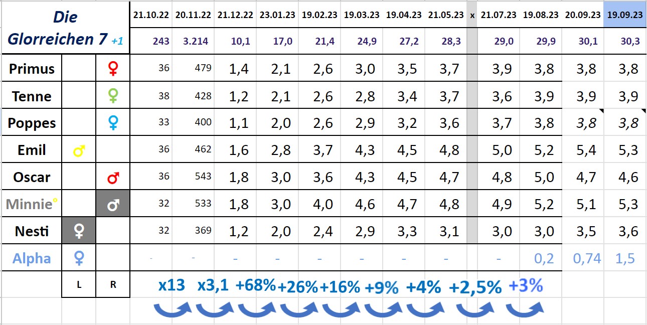 19.10.23 Die Monatswiegung im Oktober ist eine besondere: Die Glorreichen Sieben sind an eben diesen Tagen 19./20. im letzten Jahr geschlüpft. Ein Geburtstagsvideo folgt morgen, die Monatwiegung heute, und so sehen die Werte aus: