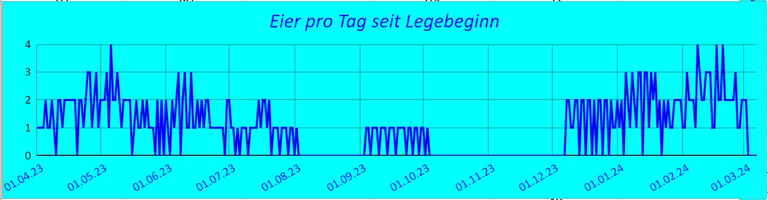 In dieser Grafik sieht man für jeden Tag, wieviele Eier insgesamt gelegt wurden. Seit dem 1.4.23 von vier Hennen, seit dem 17.1.24 von fünf Hennen.