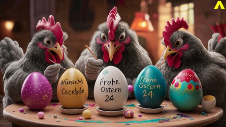 Unsere Hühner bemalen gerade die Eier. Mit dem Text hakt es noch etwas, das kann aber auch an der KI liegen, die kann nämlich nur Englisch (ideogram.ai).