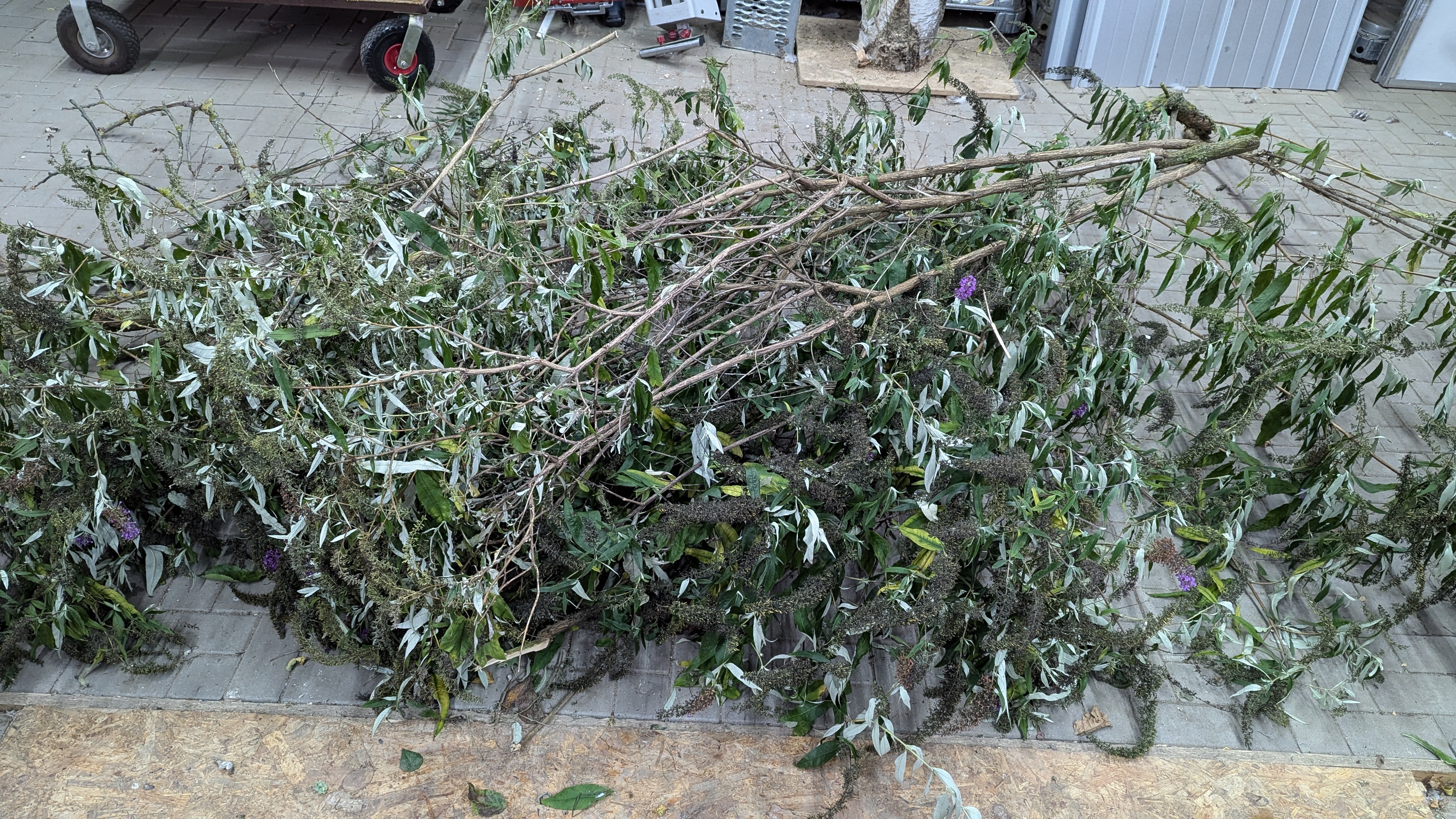 vor Sturm - und es kam nur Wind. Heute gab es keine Warnungen für unsere Region - und wir haben einige Schäden durch Sturm: Der Schmetterlingsflieder im Hof ist deutlich dezimiert, und auch die