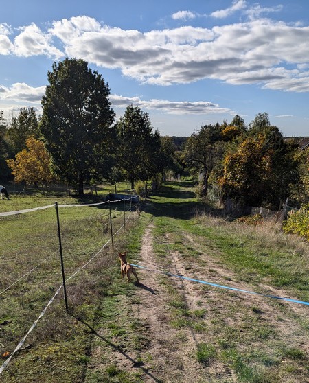 12.10.24 In den letzten Tagen haben wir eine Runde durchs Dorf gemacht und sind ein paar mal unsere Straße auf und ab gegangen. Beides war für Elli sehr aufregend, auch, weil überall Hunde gebellt haben. Wir haben dann entschieden, zunächst lieber hinten im Garten den Patrouillenweg (siehe letzter 'Gartenrundgang' auf YT) zu gehen, immer nach einem Aufwachen oder Futtern. Das hat sich bewährt. Aber heute ist so schönes Wetter, da wollten wir doch mal eine 'richtige' Runde gehen, aber ganz ohne andere Hunde. Es ist etwas länger geworden: