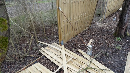15.2.22 Zwei Stürme im Februar haben den Zaun zum Nachbarn auf ganzer Länge zerstört. Dieses war ein leichter Zaun aus Holzgeflecht, welches teilweise aus dem Rahmen gebrochen ist, teilweise mitsamt dem Rahmen von der Bodenverankerung aberissen wurde.