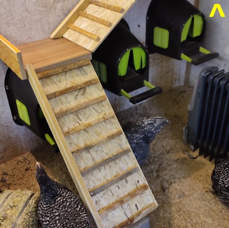Die Fensterbank ist zwar gemütlich, weil ganz neu eingebaut und gut isoliert, aber wir finden schon, dass alle Damen und Herren zusammen auf der Stange schlafen sollten. Also haben wir heute eine neue, flachere Leiter eingebaut.