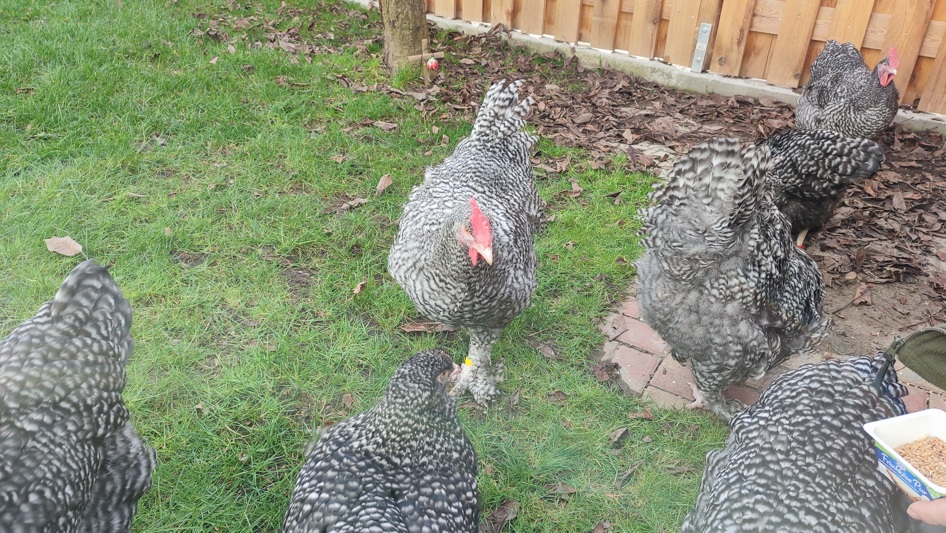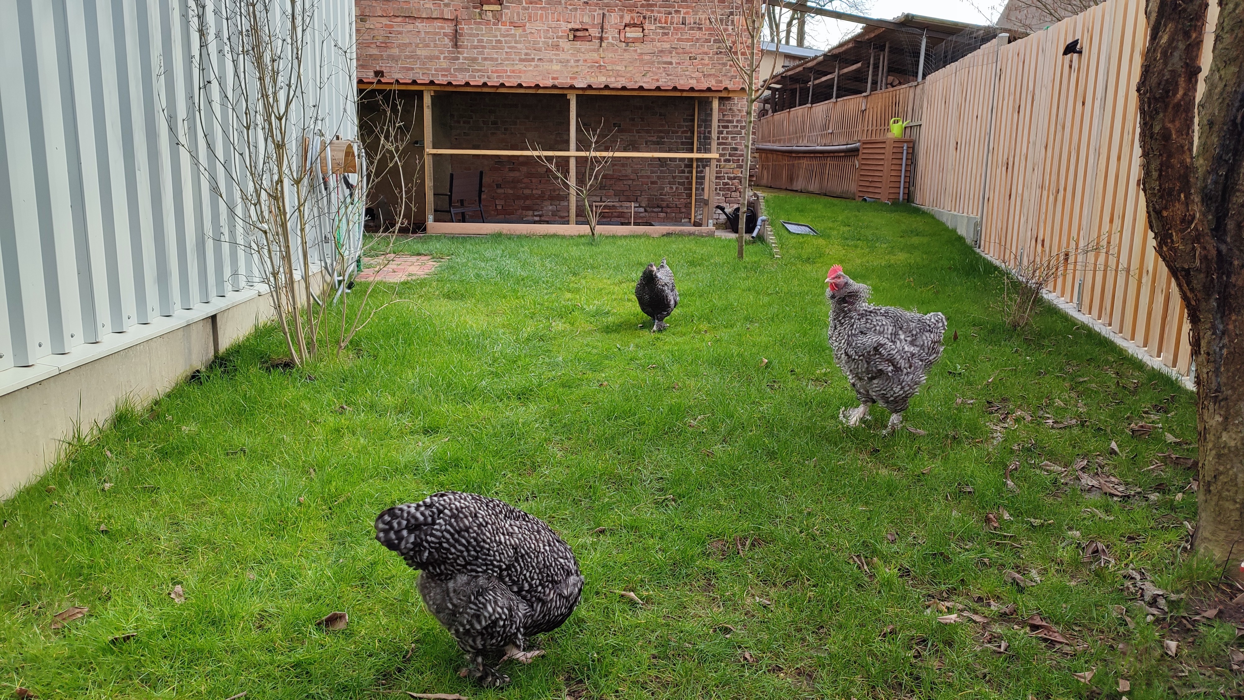 23.03.23 Erstmals sind die Hühner aus der Voliere in den Hühnergarten gekommen. Und wir hatten sehr den Eindruck, sie würden sich richtig und ausgelassen freuen. Mal eine längere Strecke rennen, auch mal ausgiebig flattern, nach Herzenslust überall zupfen und auch Würmchen und allerlei anderes Getier unter den Blättern suchen und finden. Besonderes Erlebnis: Zunächst hat sich Poppes nicht getraut und ist rufend allein in der Voliere geblieben. Oscar ist immer wieder zu ihr hin - und hat sie letzlich mit zu den anderen gebracht. Das war Fürsorge, durch einen fünf Monate alten Hahn. Wunderbar.