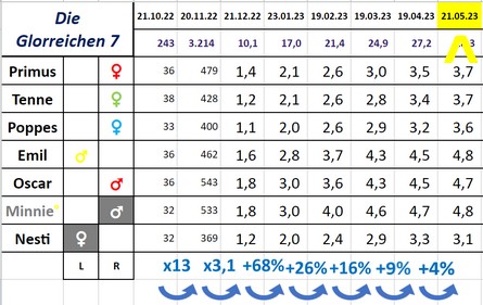 21.5.23 Eigentlich wäre diese Wiegung schon am 19. fällig gewesen, aus 'organisatorischen Gründen' haben wir sie aber auf heute verschoben. Und das ist dabei rausgekommen: