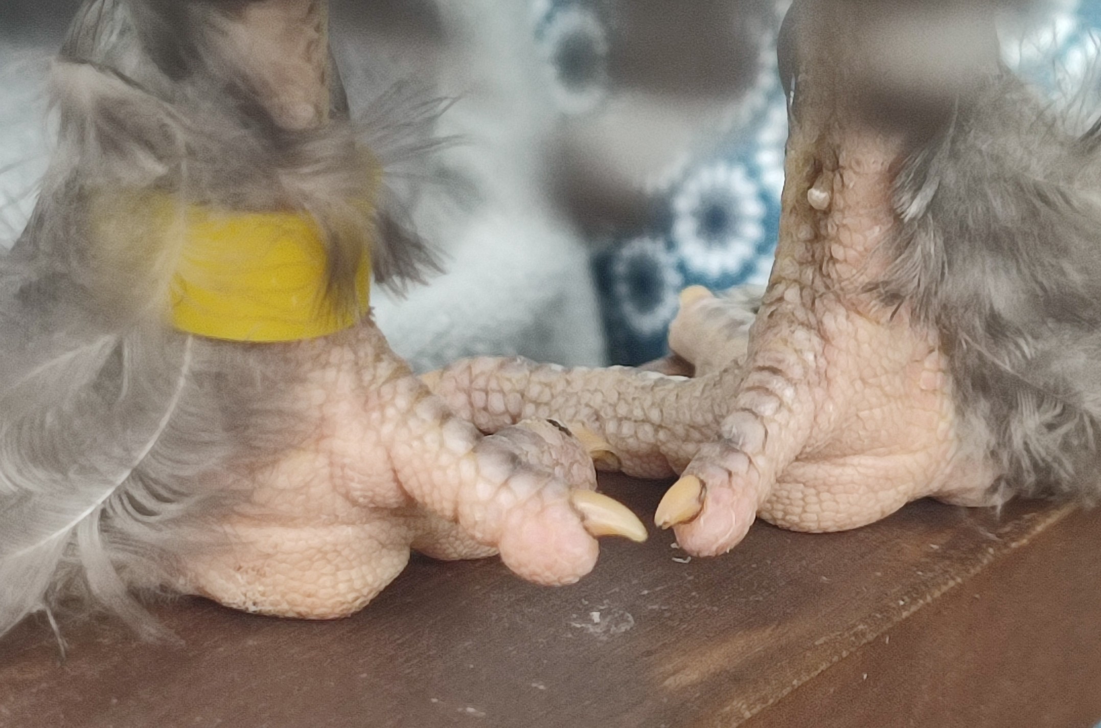 Alpha ist erst zwei Monate alt, wächst aber schnell heran, und ihre Füße sehen rassetypisch schon aus, als seien sie von einem alten Mann - oder auch Gollum. Aber, das ist nur Optik: Wenn sie einem auf dem Arm sitzt oder in der offenen Hand getragen wird (wir werden gelegentlich als Fahrstuhl genutzt), dann spürt man super weiche und warme Füße. Das ist sehr angenehm. Auf dem großen Bild erkennt man gut den gelben Ring, der Alpha im Gebüsch leichter zu finden macht.