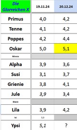 20.12.24 Einen Tag nach dem 'Soll' - mal wieder. Und es gibt auch nichts Besonderes zu vermelden: Oskar hat sein bisheriges Höchstgewicht erreicht, und auch die Damen haben alle zugelegt. Der Schlenker bei Jule ist vermutlich eine Fehlschätzung im letzten Monat, weil sie da partout nicht auf die Waage wollte. Auch heute ging das nur mit Greifen, Beruhigen und Draufsetzen. Sie hat es 'gerade so überlebt'. Und ordentlich Nudeln zur Besänftigung erhalten...