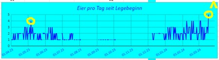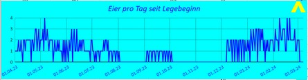 In dieser Grafik sieht man für jeden Tag, wieviele Eier insgesamt gelegt wurden. Seit dem 1.4.23 von vier Hennen, seit dem 17.1.24 von fünf Hennen.
