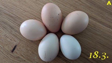 18.3.24 Der 6.Mai des letzten Jahres war der bisher einzige Tag, an dem jede der (damals noch vier) legenden Hennen ein Ei gelegt hat. Heute war es wieder soweit: Alle (jetzt sind es ja fünf) Damen haben heute - recht unterschiedliche - Eier in die Nester gelegt: