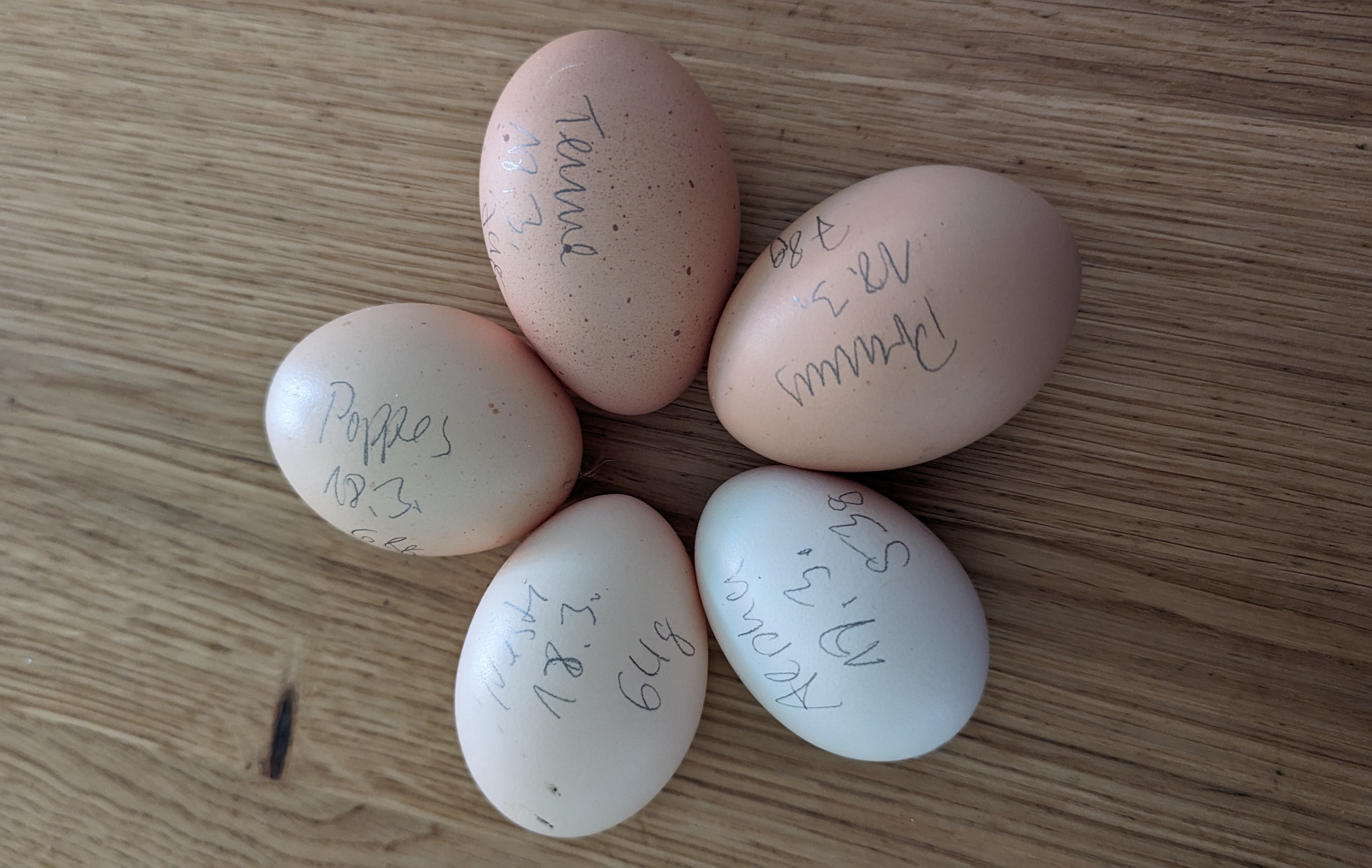 Wir selbst können nicht so viele Eier essen, wie unsere lieben Damen legen. Wir geben zahlreich davon ab, auch zu sehen im Eiertagebuch (Arbeitsblatt 'Eiabgaben'). Aber wir halten unsere Hühnerschar ja nicht wegen der Eier, sondern wegen der Freude am Umgang mit ihr: Alle Acht sind freundliche Individuen, jeder und jede mit Eigenheiten und Vorlieben. Sie sind für uns nicht Nutztiere, sondern Haustiere. Sie haben Namen - und werden auch sonst nicht wie so viele andere Hühner gehalten und behandelt.