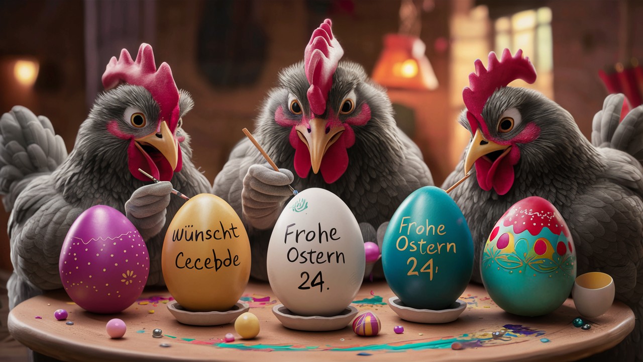 Unsere Hühner bemalen gerade die Eier. Mit dem Text hakt es noch etwas, das kann aber auch an der KI liegen, die kann nämlich nur Englisch (ideogram.ai).