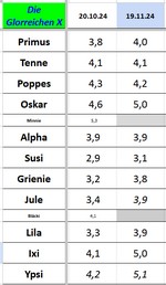ergeben. Lediglich die leichte Gewichtsabnahme von Poppes, die aber ihrer Stimmung entspricht - sie vermisst offensichtlich Minnie, mit dem sie ja immer zusammen war. Und dass Ixi und Ypsi nun mit Oskar gleichgezogen haben. Einer der beiden jungen Jungen wird demnächst die Schar verlassen. Sie kommen beide nicht den Hahnespflichten nach. Der Verbleibende kann dann hoffentlich - ohne Rangstreitigkeiten mit dem Bruder - an Oskar ein Beispiel nehmen.