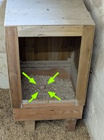 27.10.24 Jule (gelber Ring am linken Fuß) ist die jüngste unter den Legerinnnen - und derzeit die deutlich Fleißigste. Sie legt fast täglich ein Ei, aber nicht irgendwie, sondern einer ganz bestimmten Routine folgend. Kann man nicht beschreiben, daher hier eines der zahlreichen immer ähnlichen Aufnahmen einer der Überwachungskameras: